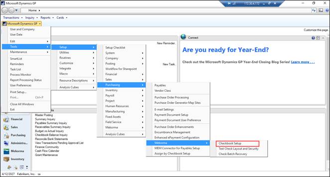 1. Open Dynamics GP and select Tools>> Setup>> Purchasing>> Mekorma>>Checkbook Setup as shown below.