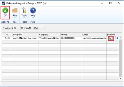 10. Click on Save on the Mekorma Checkbook Setup dialog box to finish enabling the integration for the selected checkbook.