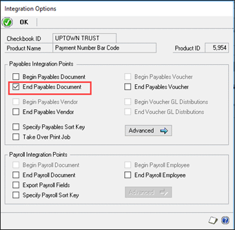 8. On the Integration Options dialog box, check the End Payables Document option as shown below: