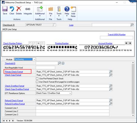 · Confirm the Checkbook ID and Primary Check Format is the same selection as configured in the previous steps.