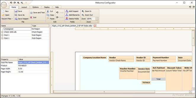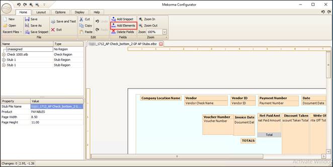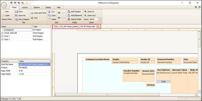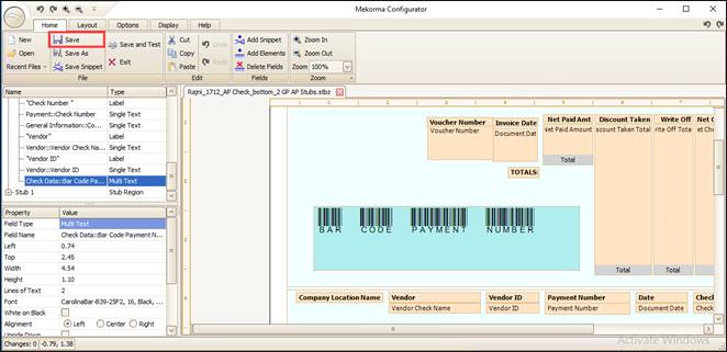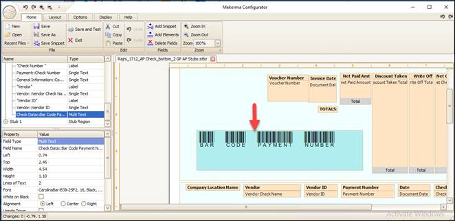 8. Drag and drop the Bar Code Payment Number to the Check Stub region and position it to give as much real estate as possible (width).