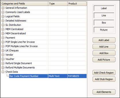 After integrating the customization with a checkbook, the Check Data::Bar Code Payment Number field is available in the Check Data category of the Mekorma Configurator for placement on the stub layout.