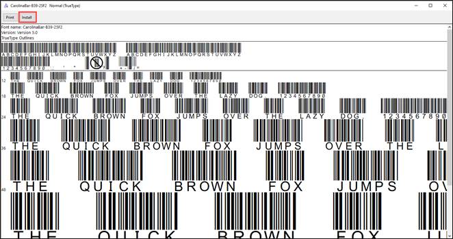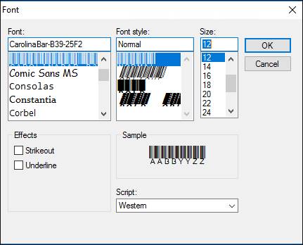 Tip: If the B39-25F2 font is not in the list of fonts, download from http://downloads.papersave.com/Support/Tools/CarolinaBar-B39-25F2-Normal.TTF |