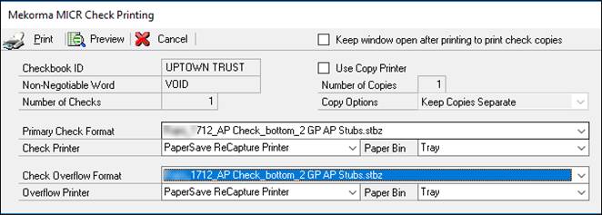 Because the Mekorma MICR Connector for PaperSave customization uses additional resources during check printing, you should only enable it for those checkbooks, which will use the functionality.