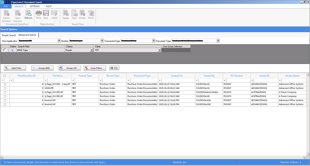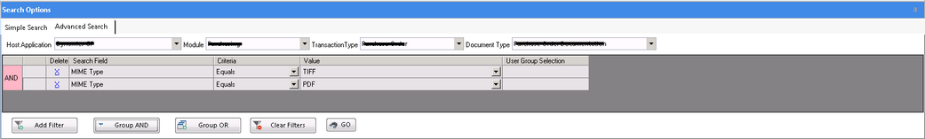 In this search, you can search for documents for a specific Module, Transaction Type and Document Type by selecting various properties of the selected Module, Transaction Type and Document Type. You can choose various operators and even group more than one search criteria.