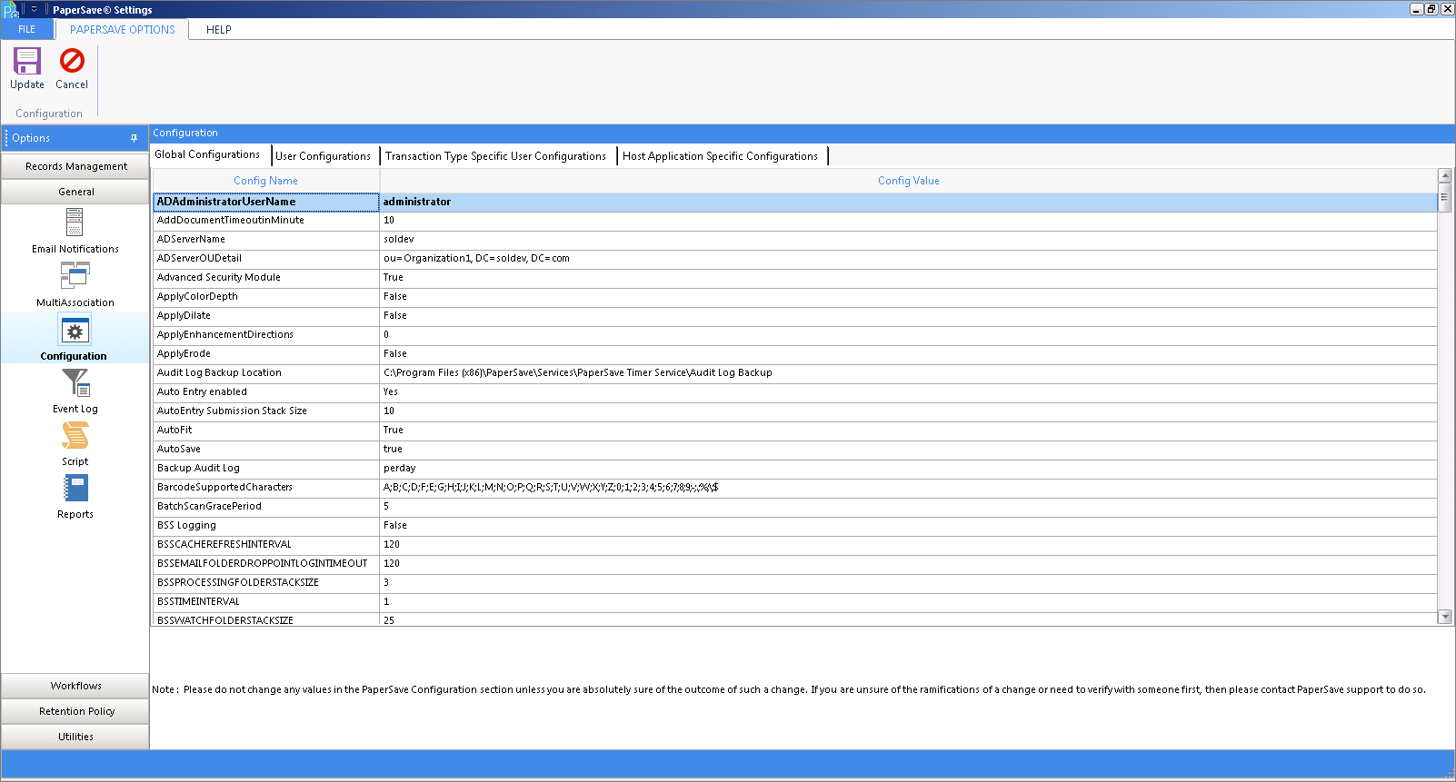 Under this tab, you can edit the global settings which will be applicable to all the PaperSave host applications on that machine as displayed in the above screen. Complete list of Global Configs with the respective description will be available in the upcoming PaperSave releases. However, description of few of the Global Configs are as follows: