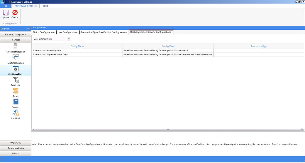Under this tab, you can edit the Host Application Specific Configurations with the following screen: