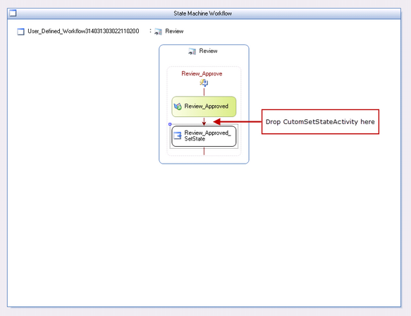 1. To create a State Activity drag an appropriate activity into the design area, then drag and drop the CustomSetStateActivity under an event after which you want the CustomSetStateActivity as shown below: