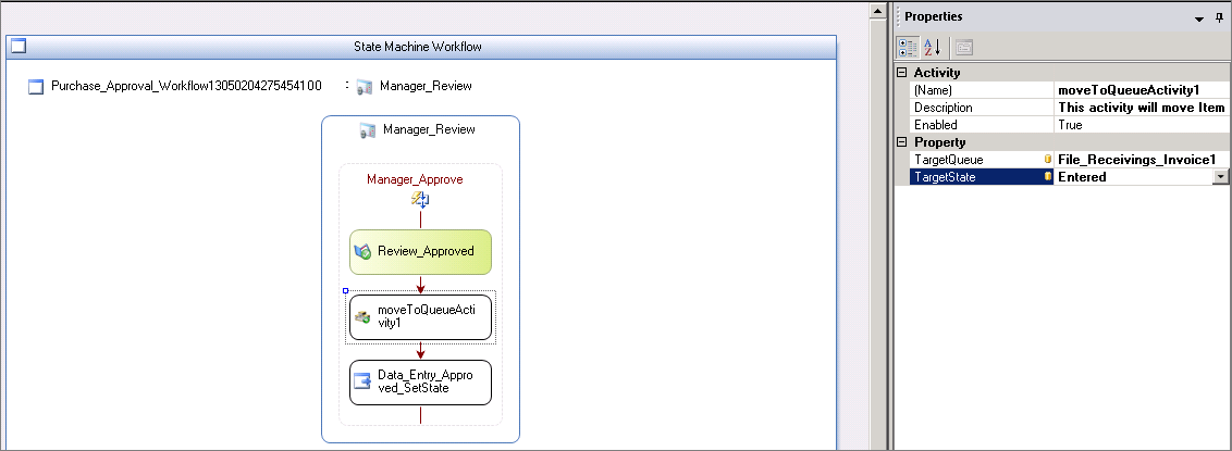 1. To create a State Activity drag an appropriate activity into the design area, then drag and drop the MoveToQueueActivity under an event after which you want MoveToQueueActivity as shown below: