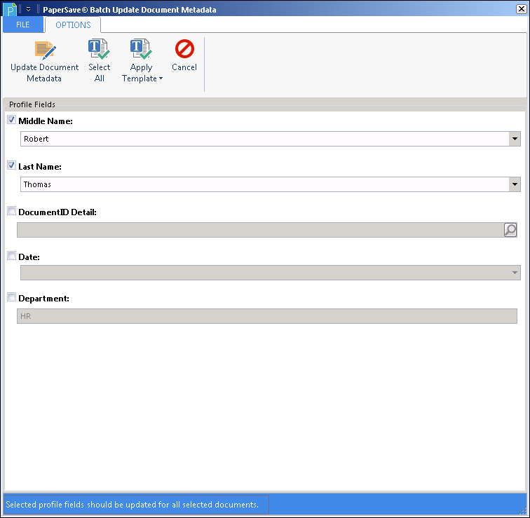 5. PaperSave Batch Update Document Metadata window will open as displayed below. You can view the list of Profile Fields that has been created for the selected Document Type from PaperSave Settings. Now you can select the desired Profile Fields that needs to be updated by selecting the checkbox against each Profile Field. Or you can click Select All button to select all the Profile Fields in a single click. Thereafter, you can update the Profile Field values as per your requirement either manually or you can click Apply Template button to fill the values using Template. Once you are done with the necessary Profile Field updates, you need to click Update Document Metadata button to update the changes. You should see a successful message once the Document Metadata is updated successfully. Click OK and exit the window.