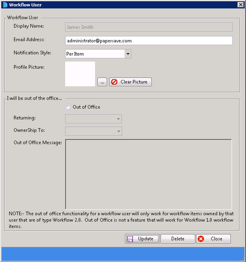 When you select Workflow User option from Run Time System Tray, below displayed window will open. You will be able to view Workflow User details of currently logged-in user. You are allowed to modify details like Email Address, Notification Style, Profile Picture and Out of Office details. Once you have done all the necessary modifications, click Update button to update the Workflow User details. You are also allowed to delete the current Workflow User by clicking Delete button. Click Close to close the window.