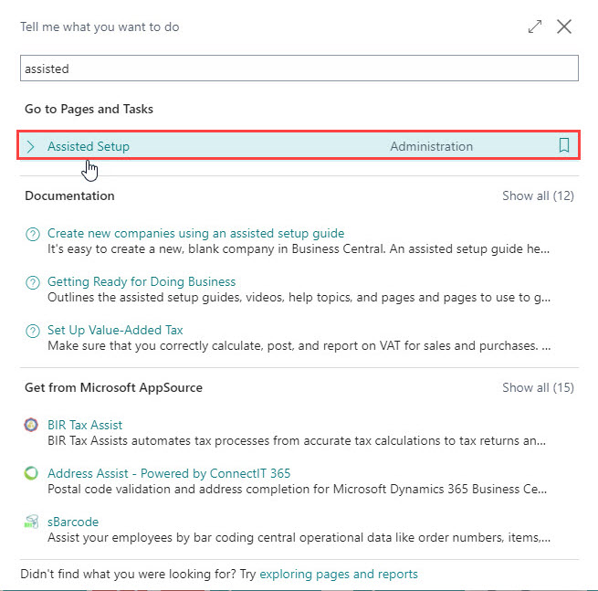 7. Click on search icon and enter “Assisted” in the search box of Dynamics 365 Business Central home.