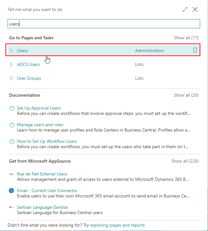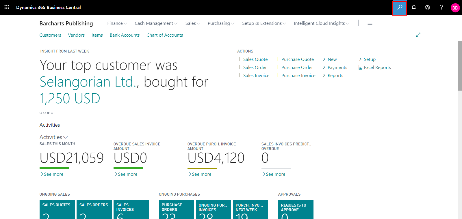 On the Dynamics 365 Business Central Home Page, click on the Search