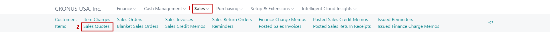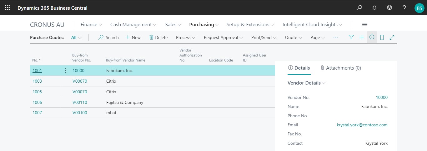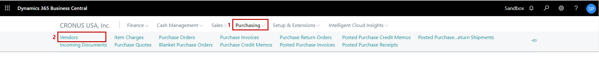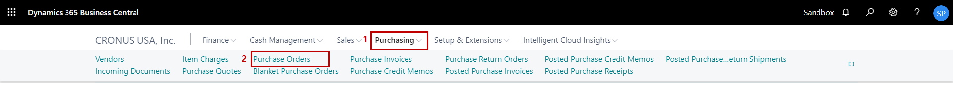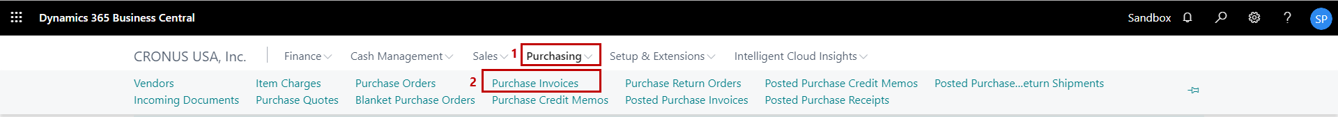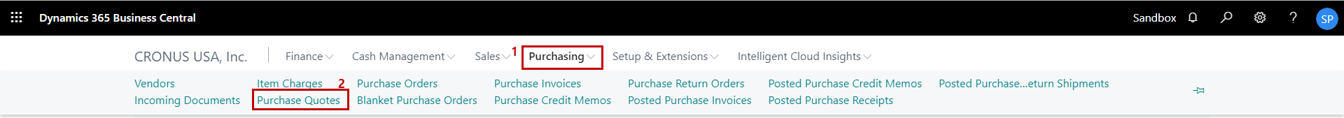 1) On the Dynamics 365 Business Central Home Page, click on the Purchasing dropdown.