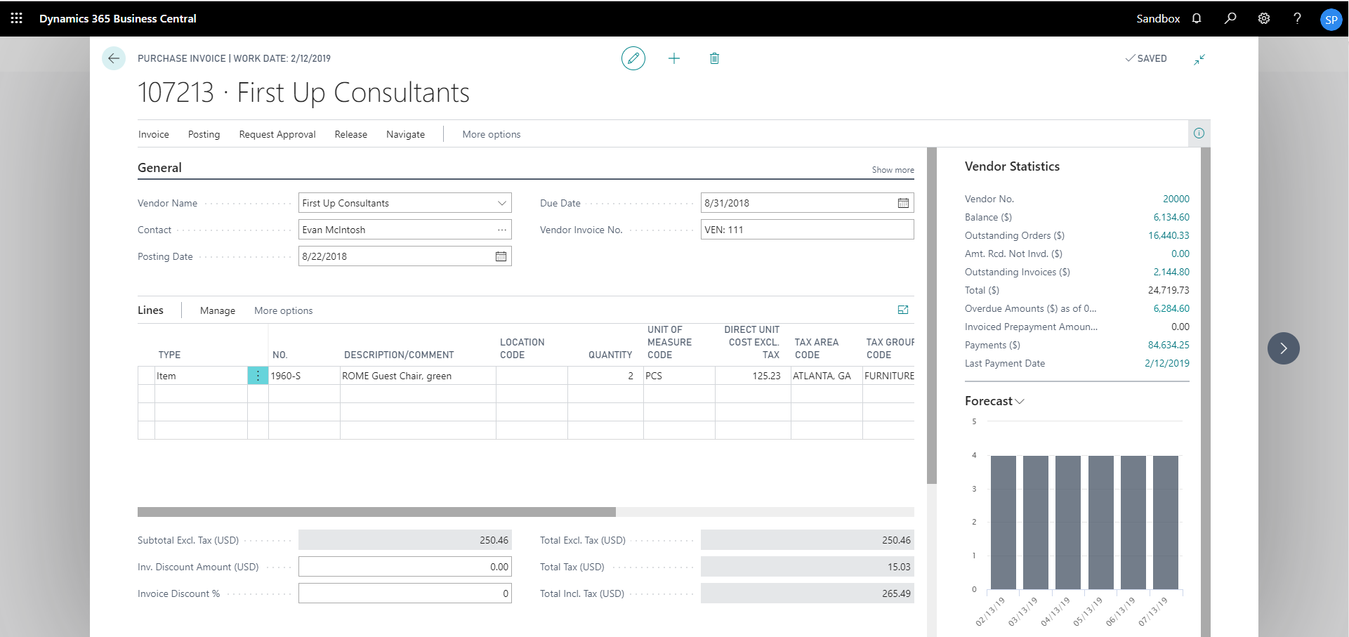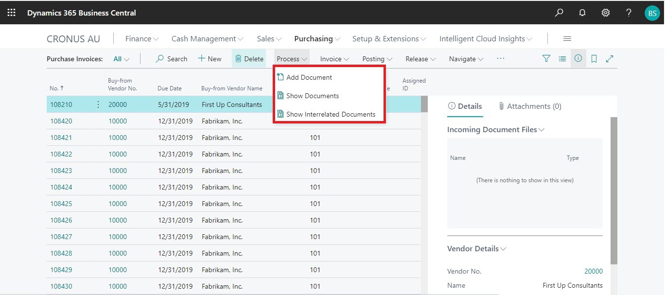8) Now, the document (which is in side by side viewer) will be associated with the current vendor record in Dynamics 365 Business Central.