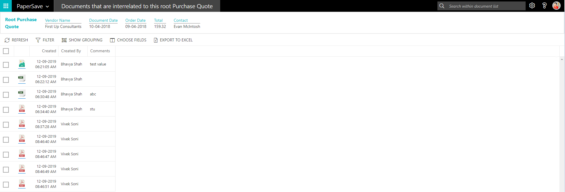 show documents from purchase quote list