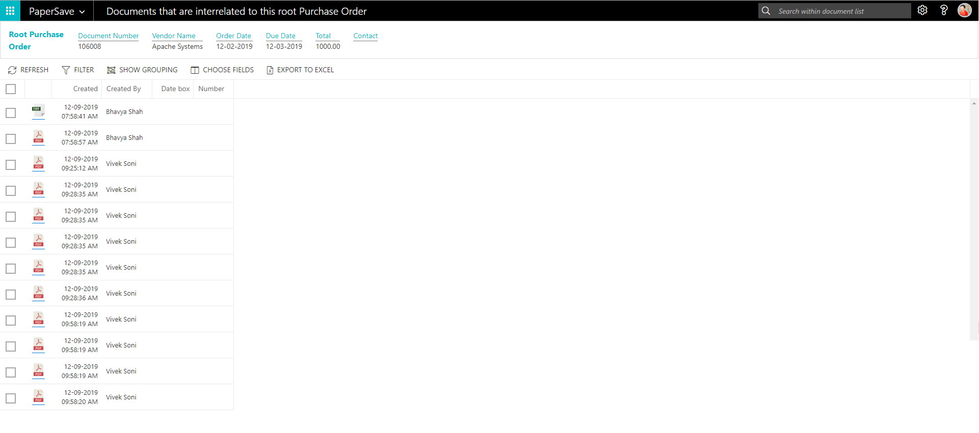 show documents from purchase order list