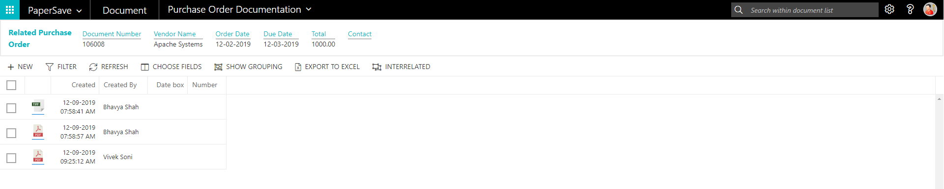 It returns the documents which are related to the Vendor. It is used by PaperSave web application to get information for Interrelated documents such as document numbers of Purchase Order, Purchase Quotes, Purchase Invoice and Posted Purchase Invoice. |