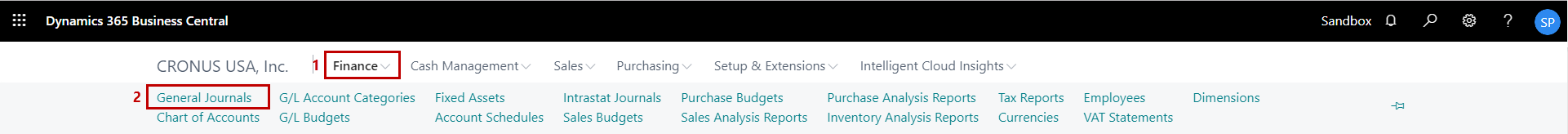 1. On the Dynamics 365 Business Central Home Page, click on the Finance dropdown.