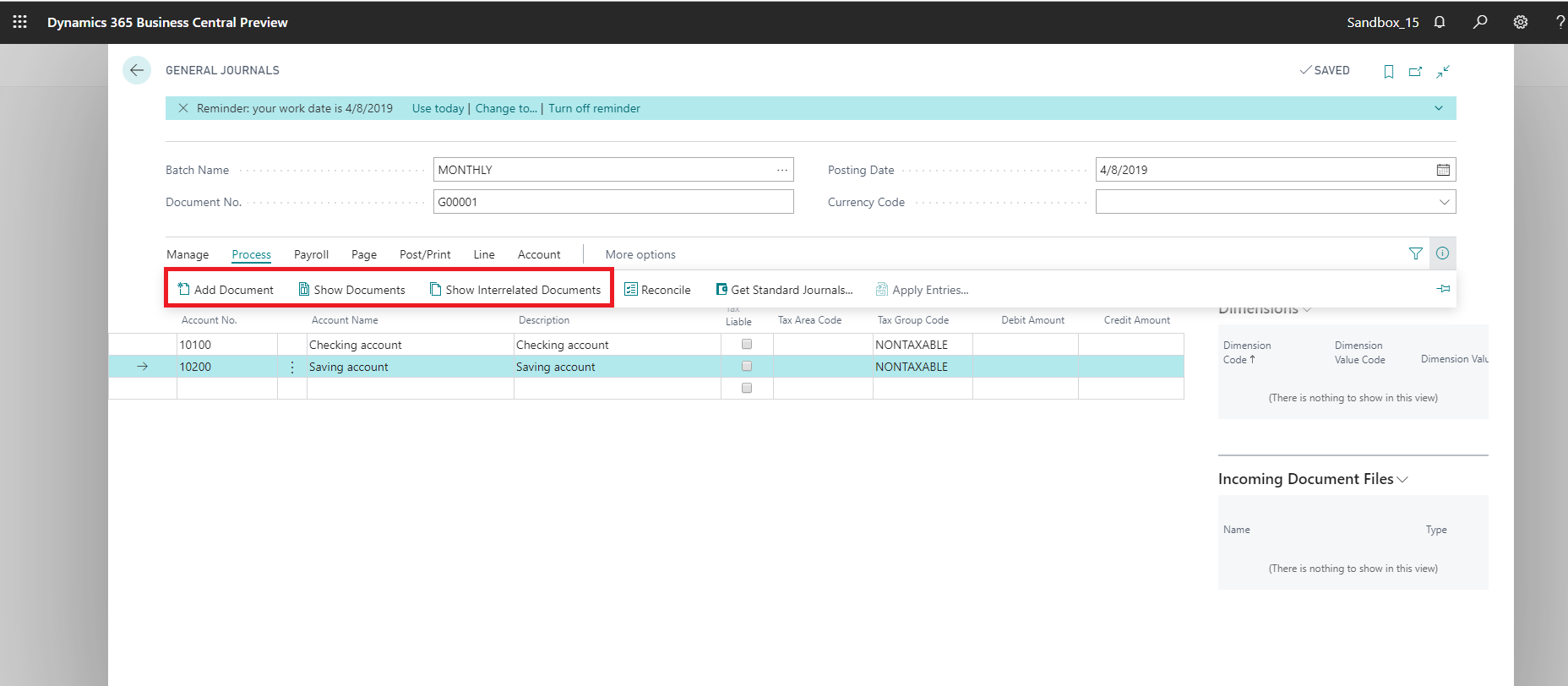 1. On the Process tab of General journals batch, click on “Show Interrelated Documents”.