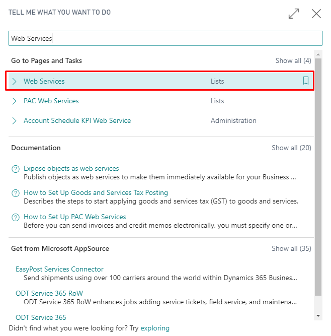 2. Enter “Web services” in the search box of Dynamics 365 Business Central home.
