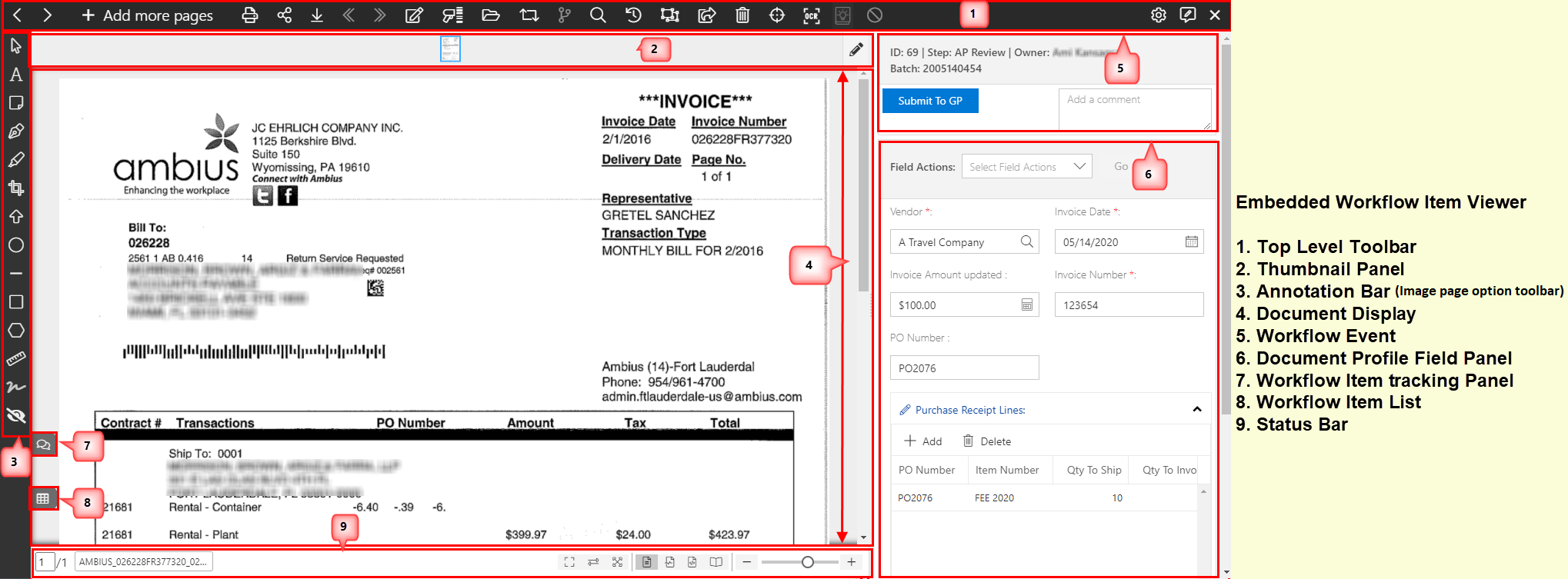Below is the brief description of various sections in Embedded Workflow item viewer: