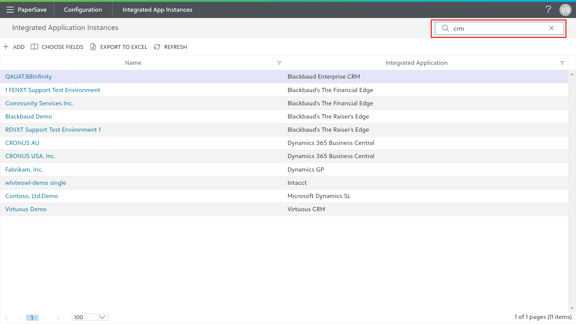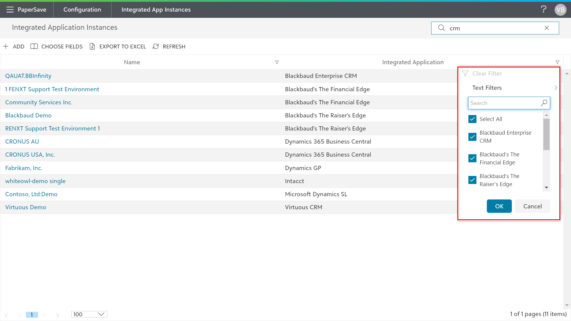 - Also, you can use a column filter to narrow the search within the list of integrated app instances, as shown in the below screen.
