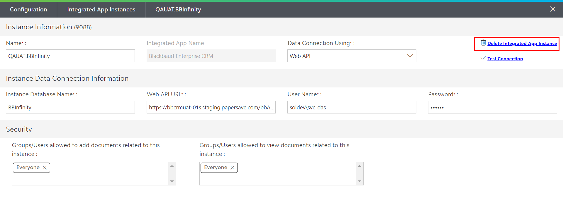 1) Click on Integrated App Instance in the Application Integration section of the Configuration Area.