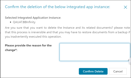 5) On clicking the Delete Integrated App Instance option, a dialog box will pop up. You must provide the appropriate reason to delete the integrated app instance and then, click on Confirm Delete option, as shown in the below screen.