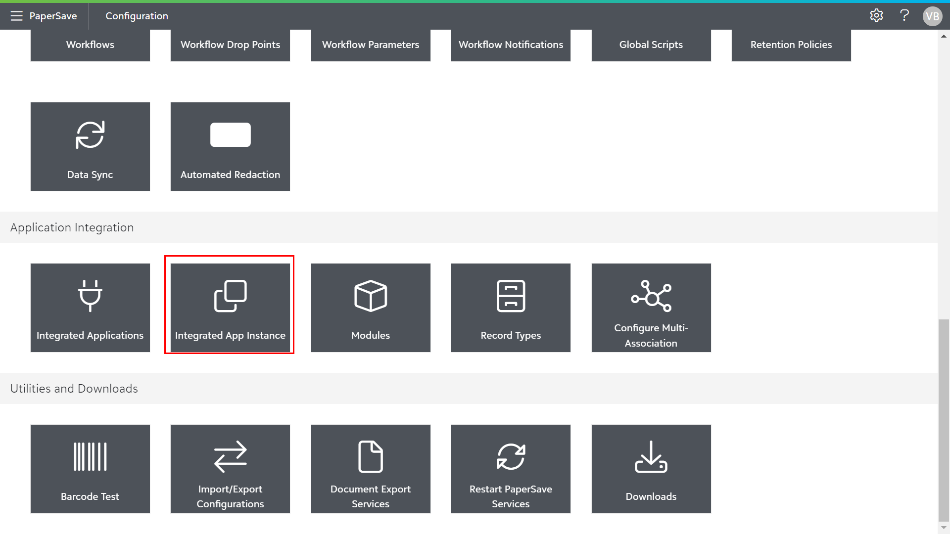 PaperSave allows you to register/deregister and manage one or more integrated app instances related to your integrated application within PaperSave by using different data connections. The Integrated App Instances module can be accessed from the Application Integration section in the Configuration Area.