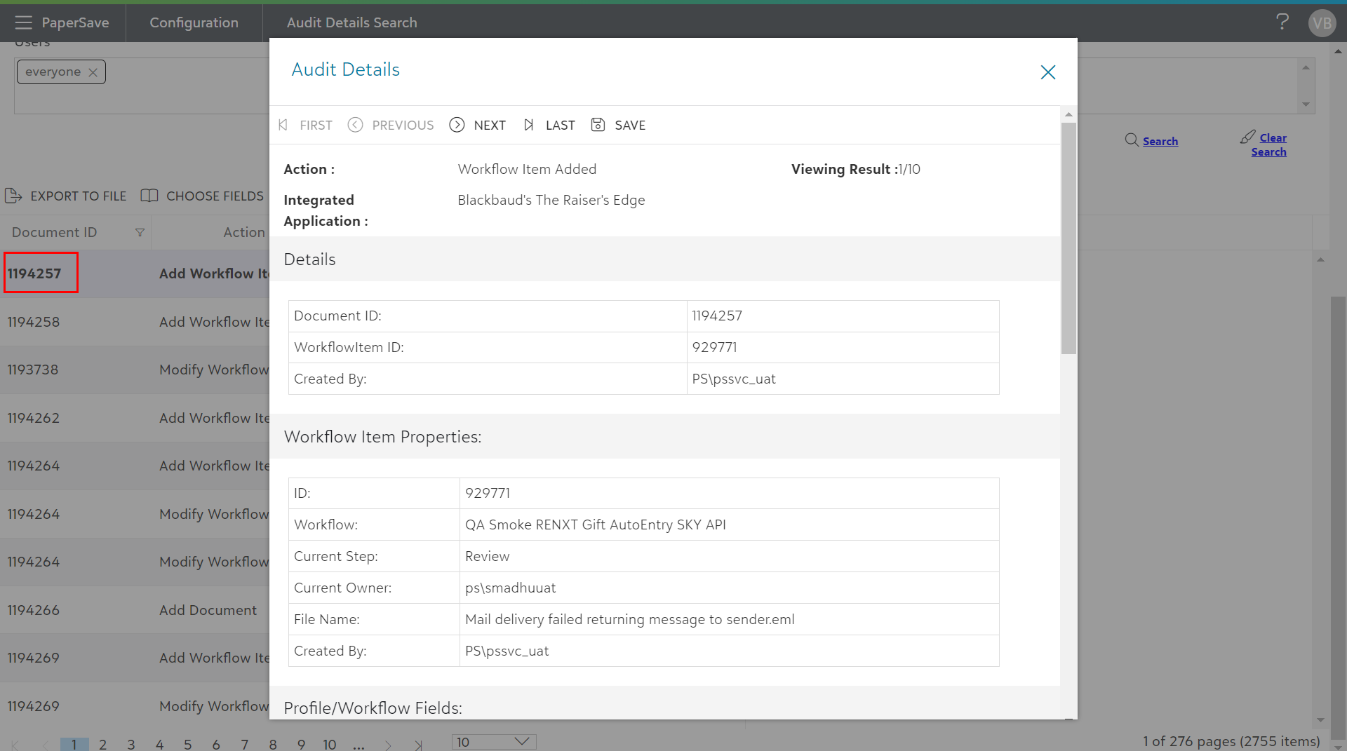 2) Audit Details dialog box will appear. Here you will see a toolbar with navigation buttons to move between items in the audit details results list.