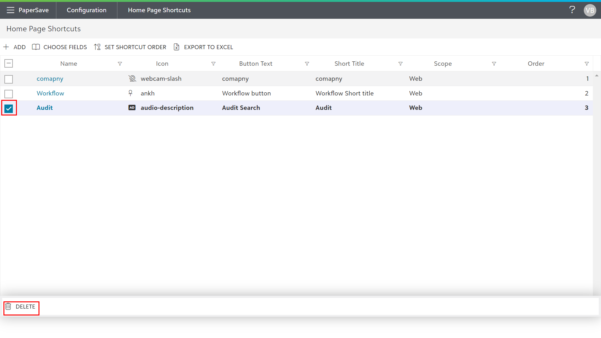1) Select one or more Home Page Shortcuts from the list using the checkboxes or directly selecting the rows, and then click on the Delete option from the slide-up panel as shown in the below screen.