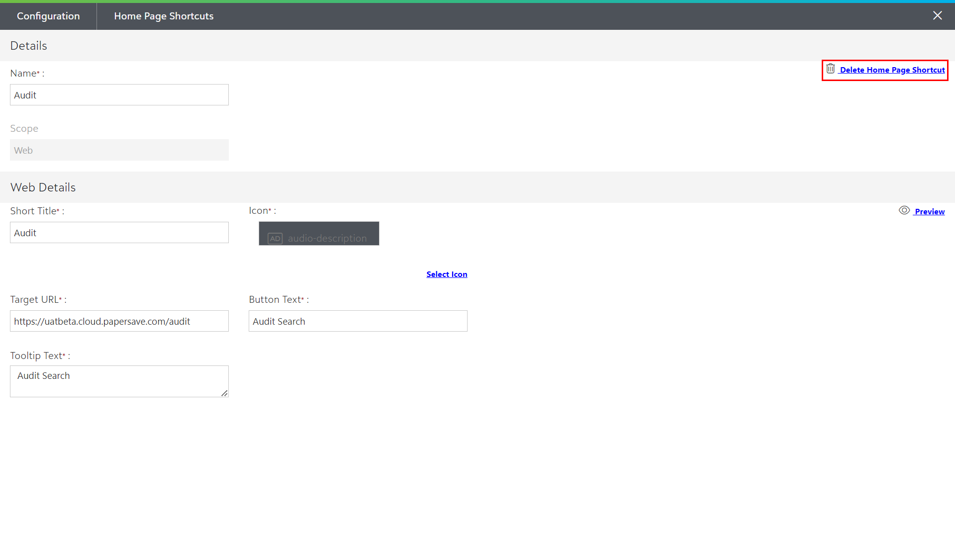 2) On the other hand, you can also open any existing shortcut and click on the Delete Home Page Shortcut option in the upper-right corner as shown in the below screen to delete a specific home page shortcut.
