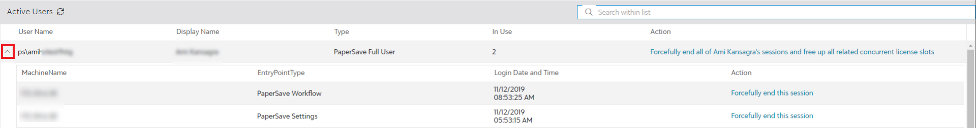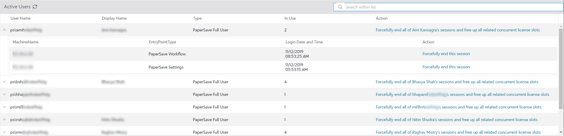The “Licensing and Active Users” page provides your PaperSave Administrator with a way to monitor the current license usage and view all the users who have acquired a license and are currently logged into PaperSave. Also, you can forcefully end the PaperSave session of a particular user should it be necessary.