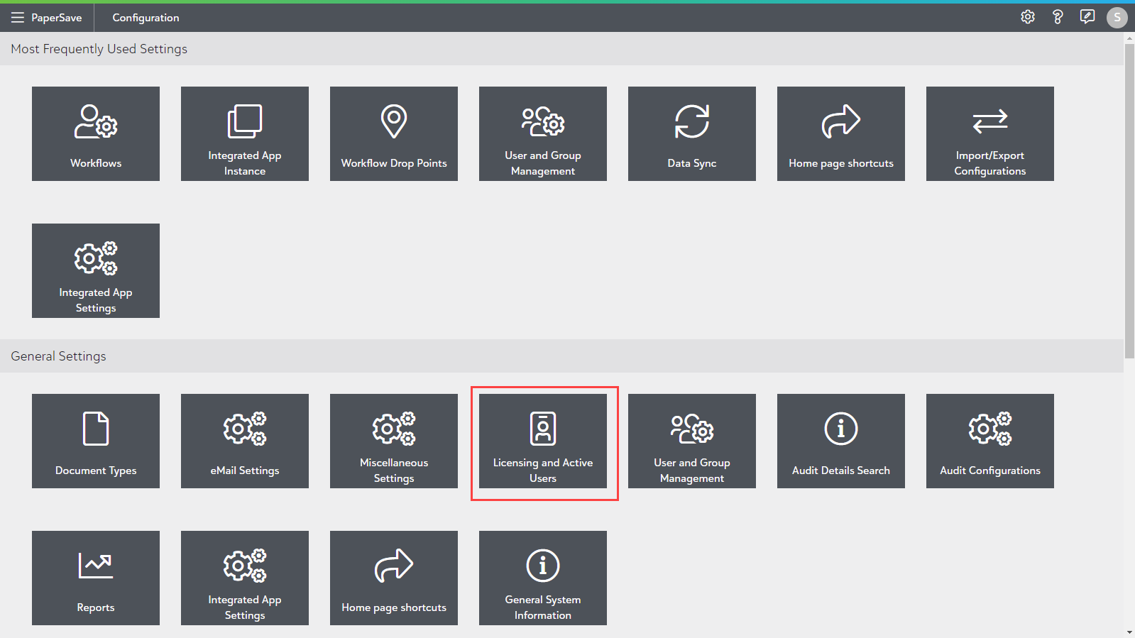 • Click on the “Licensing and Active Users” tile in the Configuration Area's General Settings section to access this area/page.