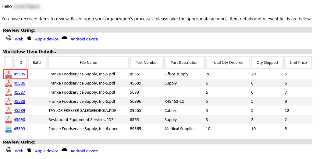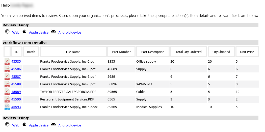 2) Review Using: This section provides you the following three ways to review any of the Workflow items received in the email. You can click on the review hyperlink to view the list of all the Workflow items in respective PaperSave application variant.