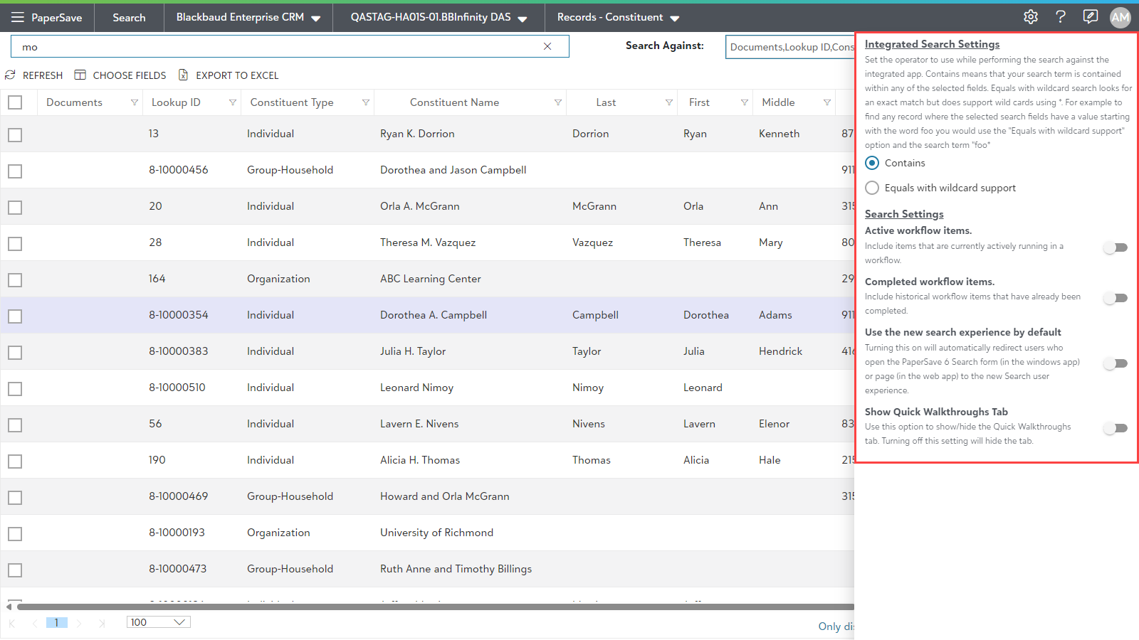 Note: The options you select in the Settings Panel will be available for all search types. Hence, any changes made when in any search area will be reflected globally for the current user.