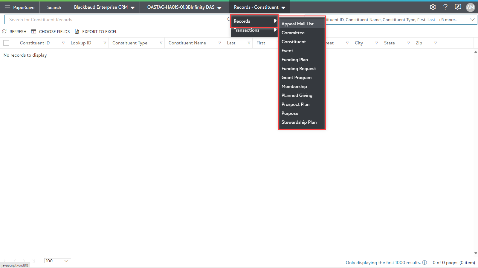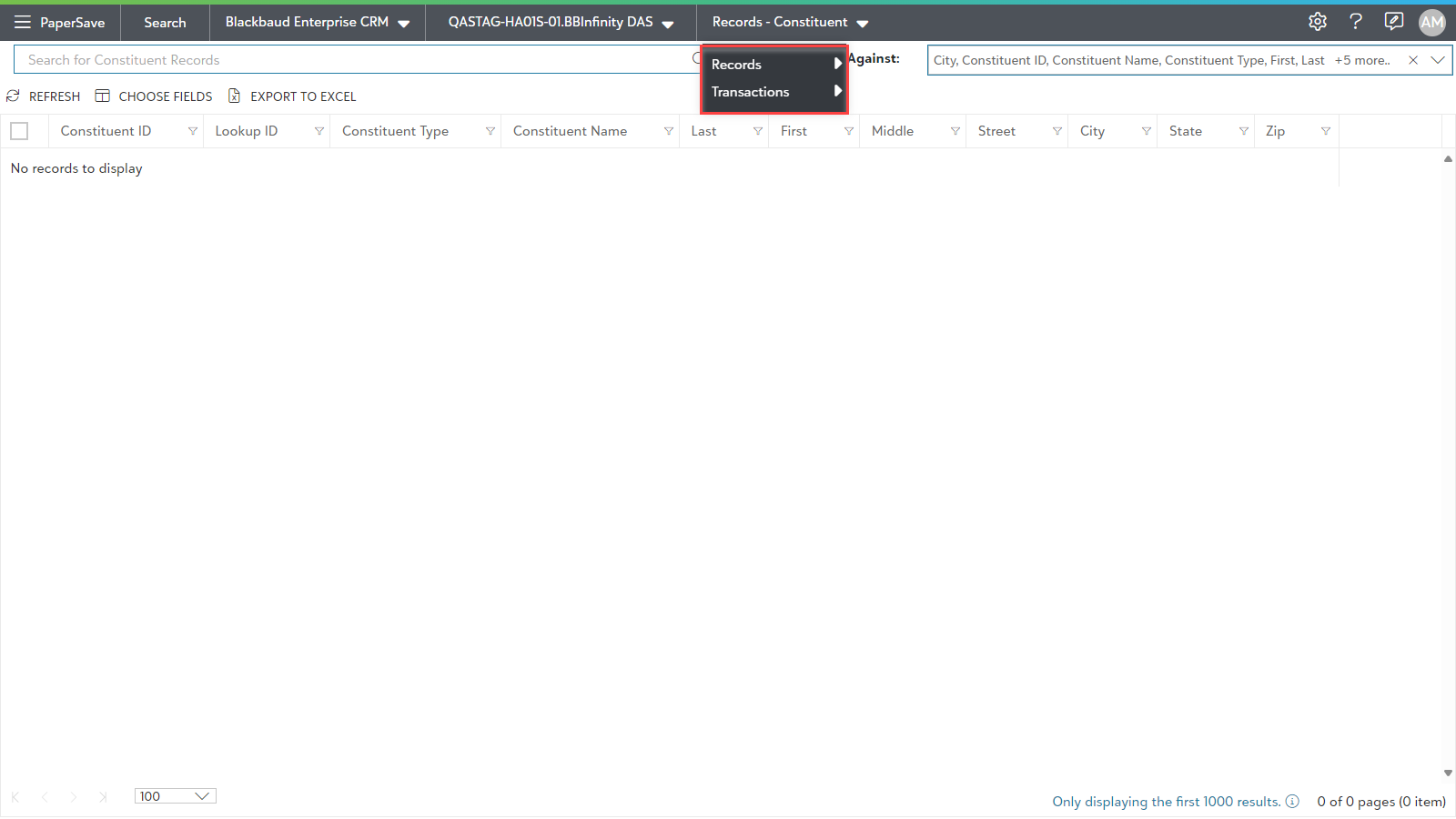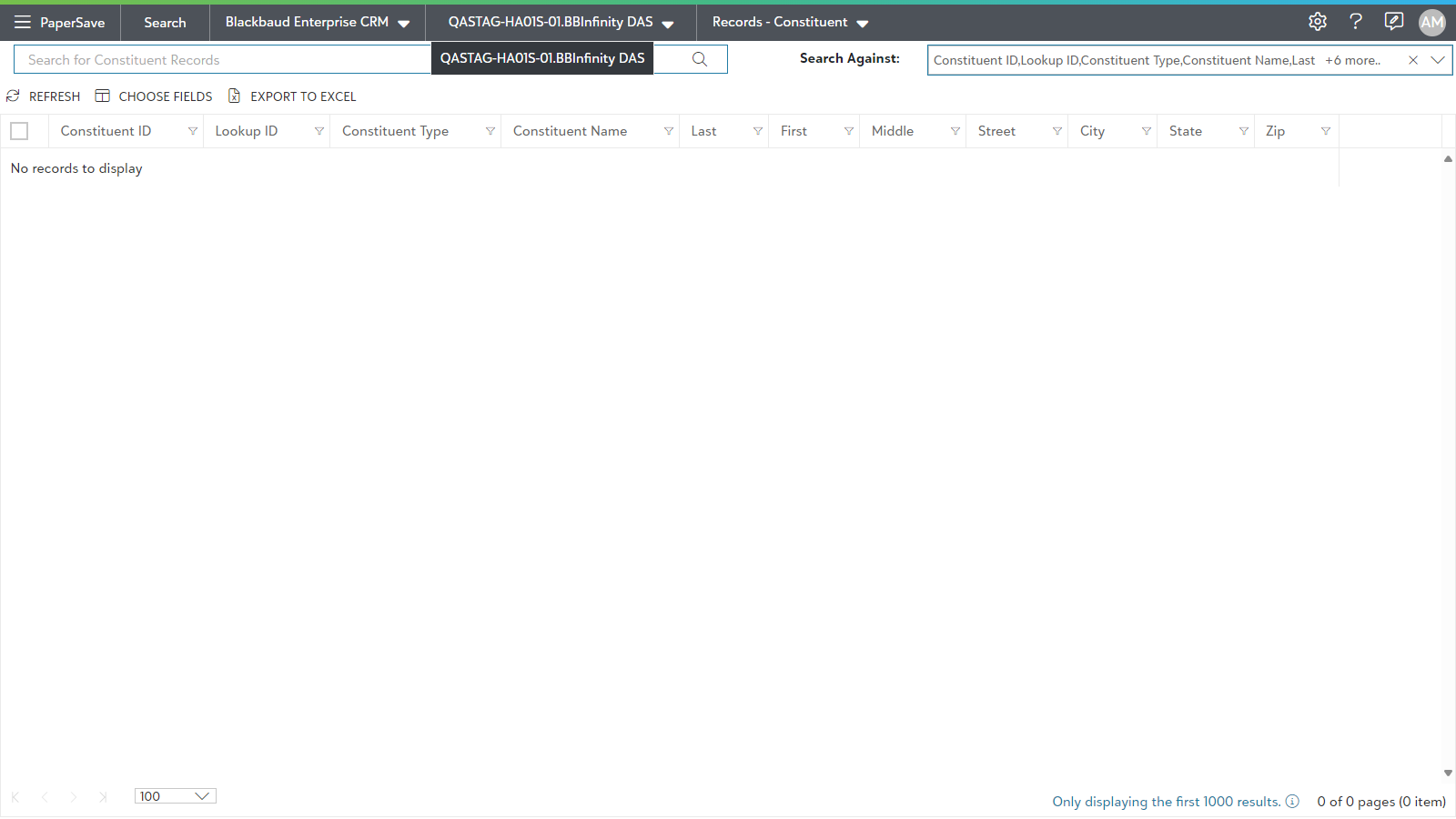 You can choose Blackbaud CRM instance from available options in drop-down list as shown in the below screen. The Search results will be displayed for the selected Integrated app instance: