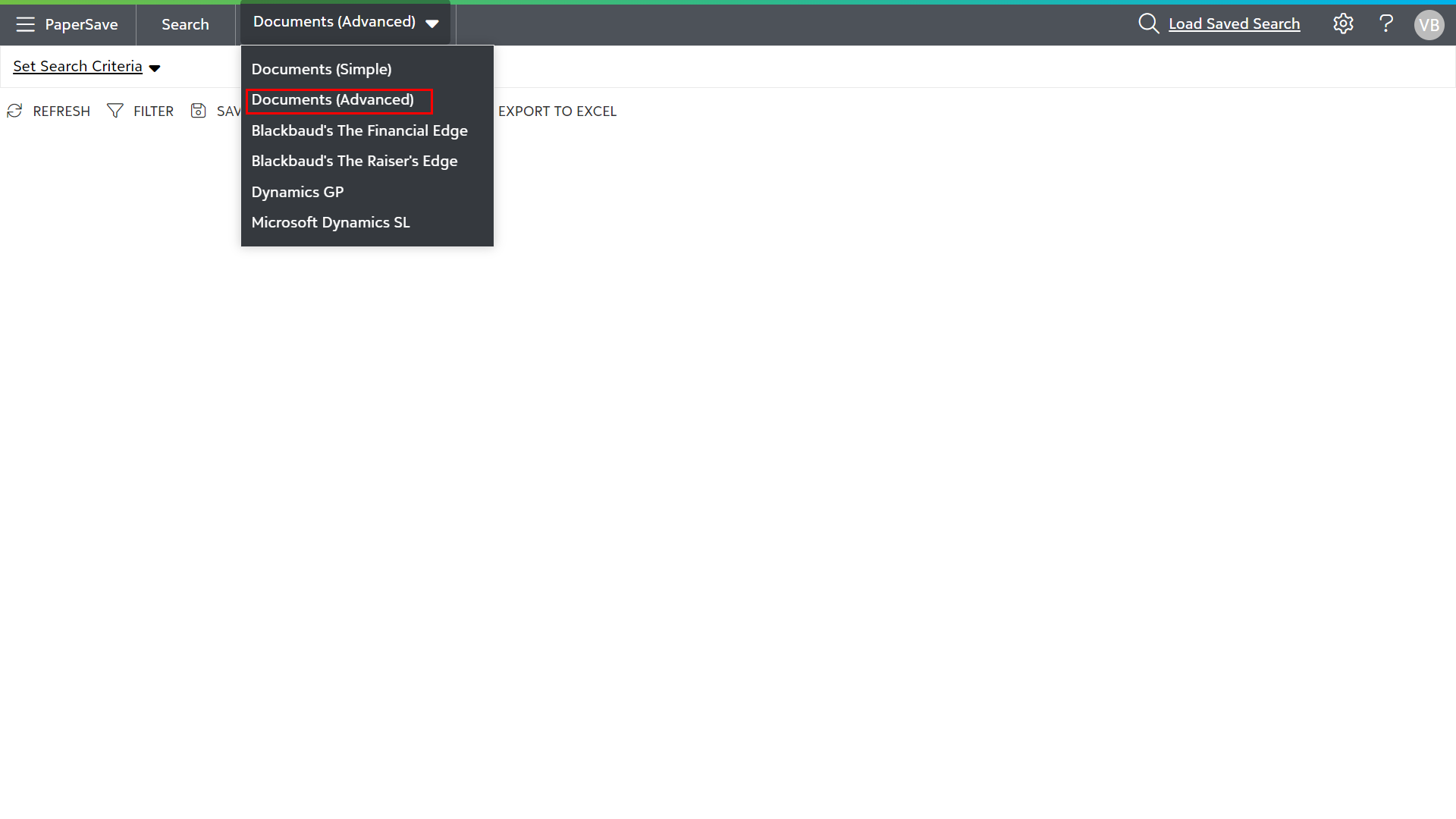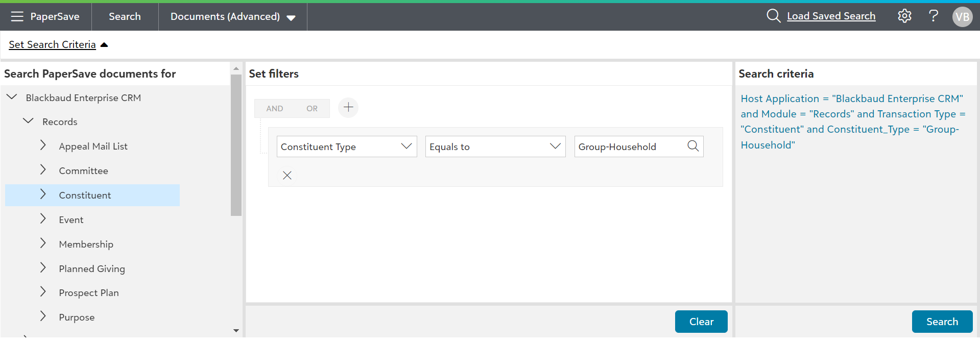 Advanced Search allows you to define a custom query and narrow down the search result by adding filter conditions. You can add filters for the Integrated application or PaperSave to search for specific item(s) within the "Set Search Criteria" panel .