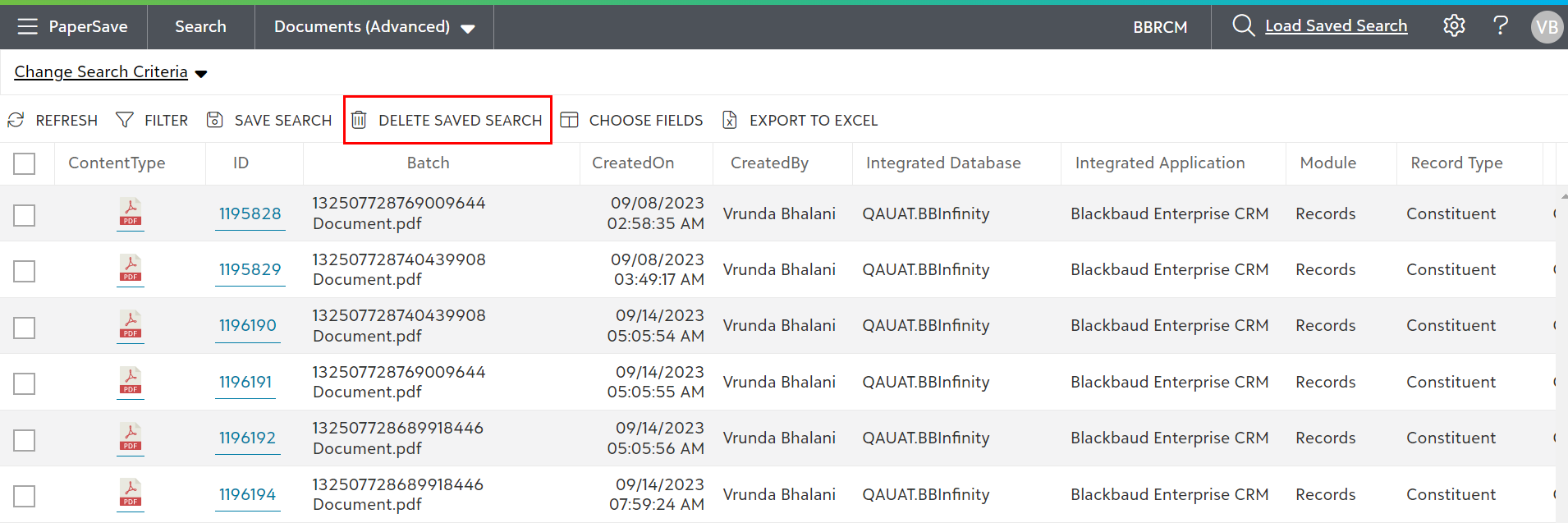 1) To remove the unwanted saved search criteria, you can click on the “Delete Saved Search” from the list toolbar. This option will be shown in the list toolbar after you have loaded a saved search.