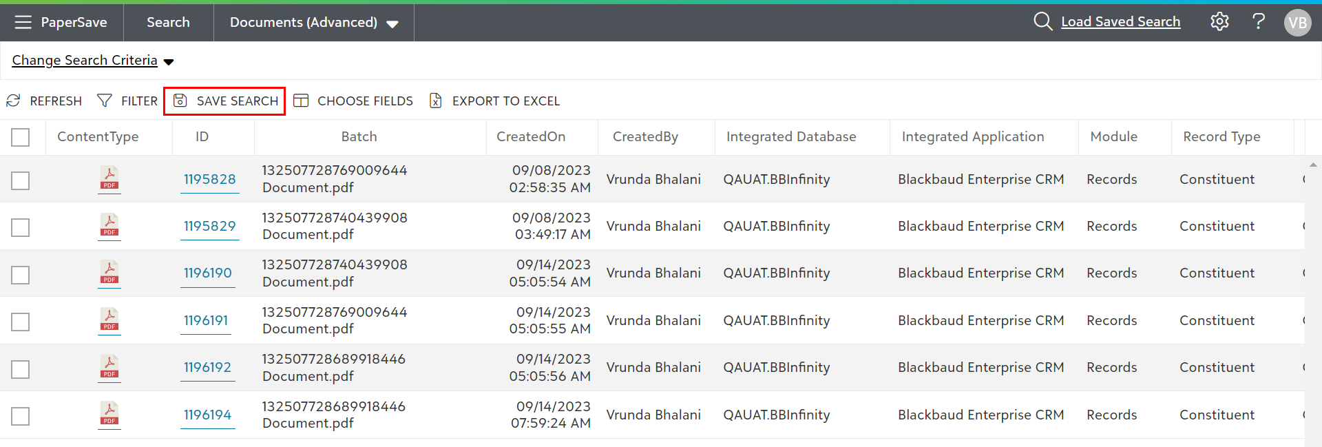 1) To save the search criteria, click on the “Save Search” option from the list toolbar, as shown below.