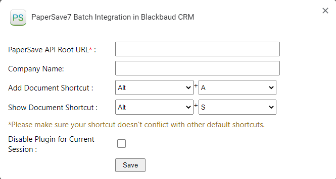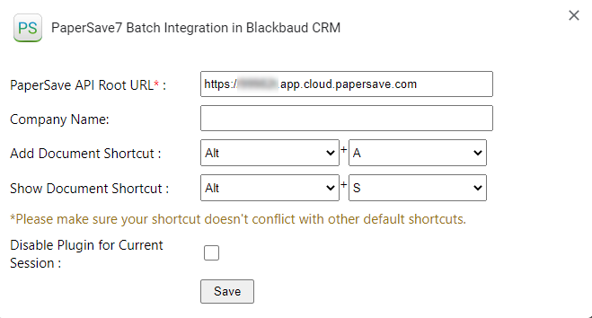 6) Enter PaperSave API Root URL (for example, 12345t.app.papersave.com). Company Name field is optional. Hence, you can enter the value if you remember the exact name else skip this field and click on Save button.