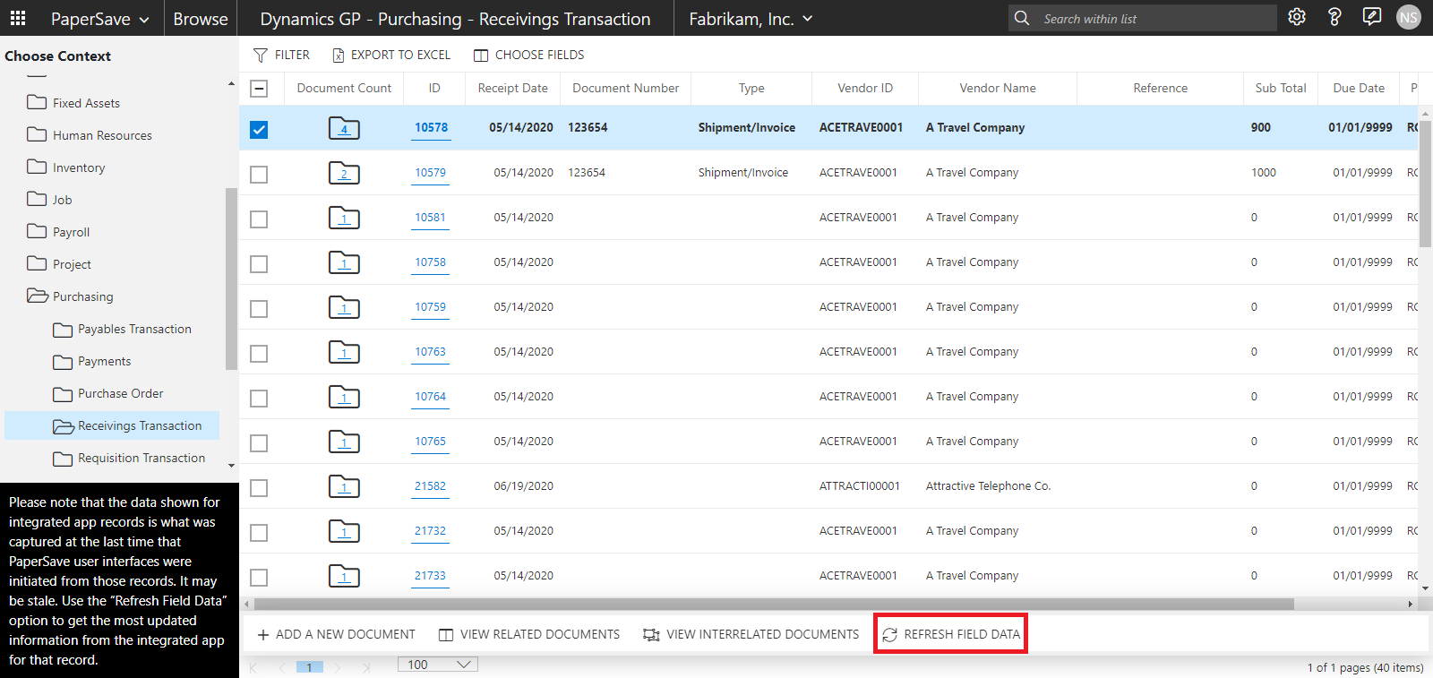 The Integrated record list shows the record field values captured at the time of associating PaperSave document to an integrated application record. Now, it is possible that the record field values have changed later directly from the Integrated application. In such cases, you will require the most updated values for these record fields.