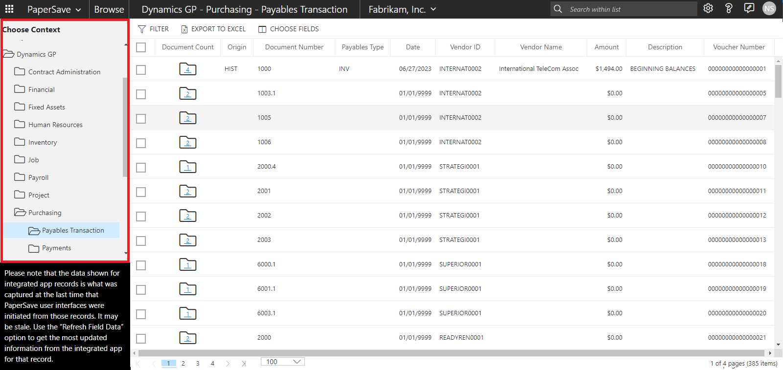 The above screen shows the list of records for the record type "Payables Transaction" in Dynamics GP. The header columns in the list will vary based on the selected record type.