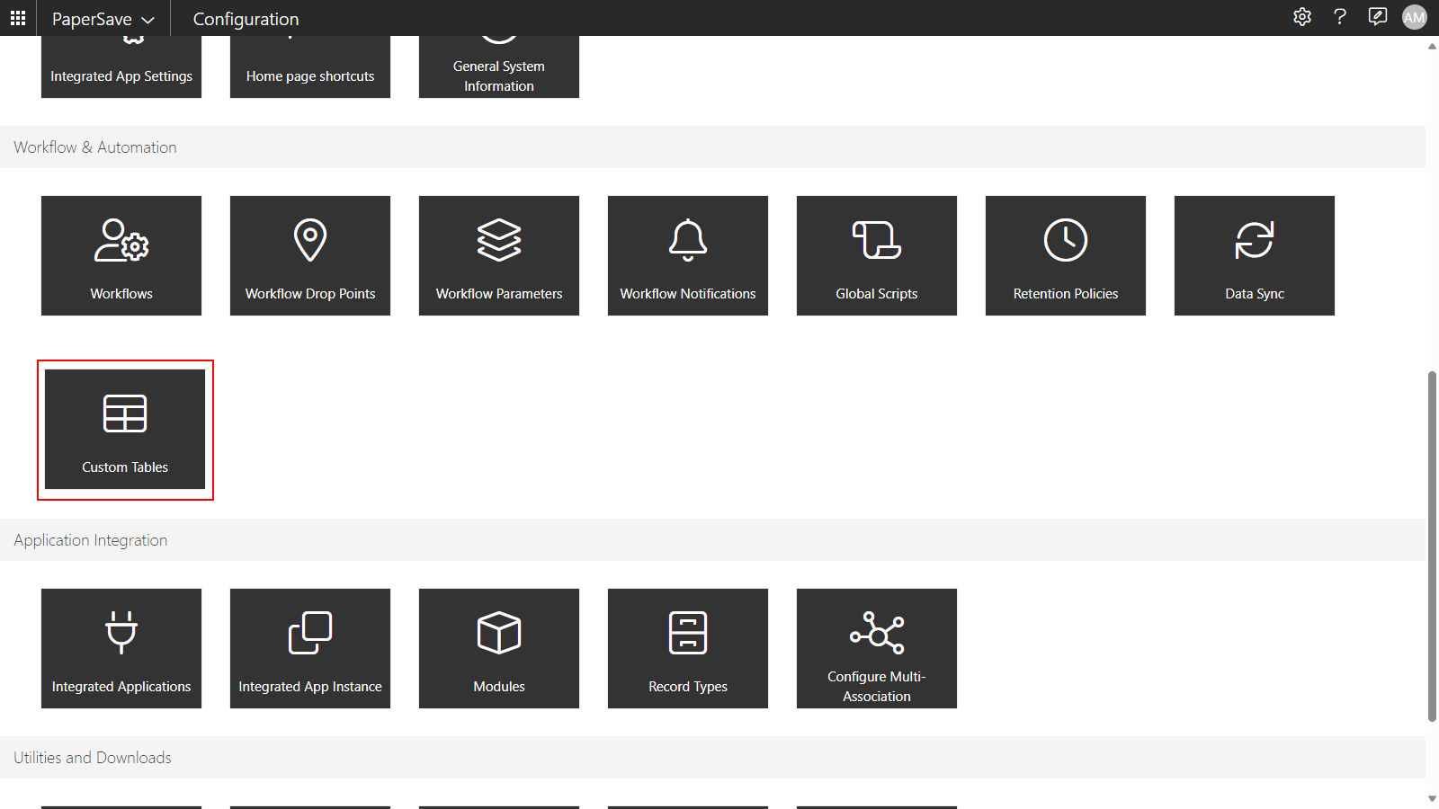1) Click on the Custom Tables tile in the Workflow and Automation section of the Configuration Area.