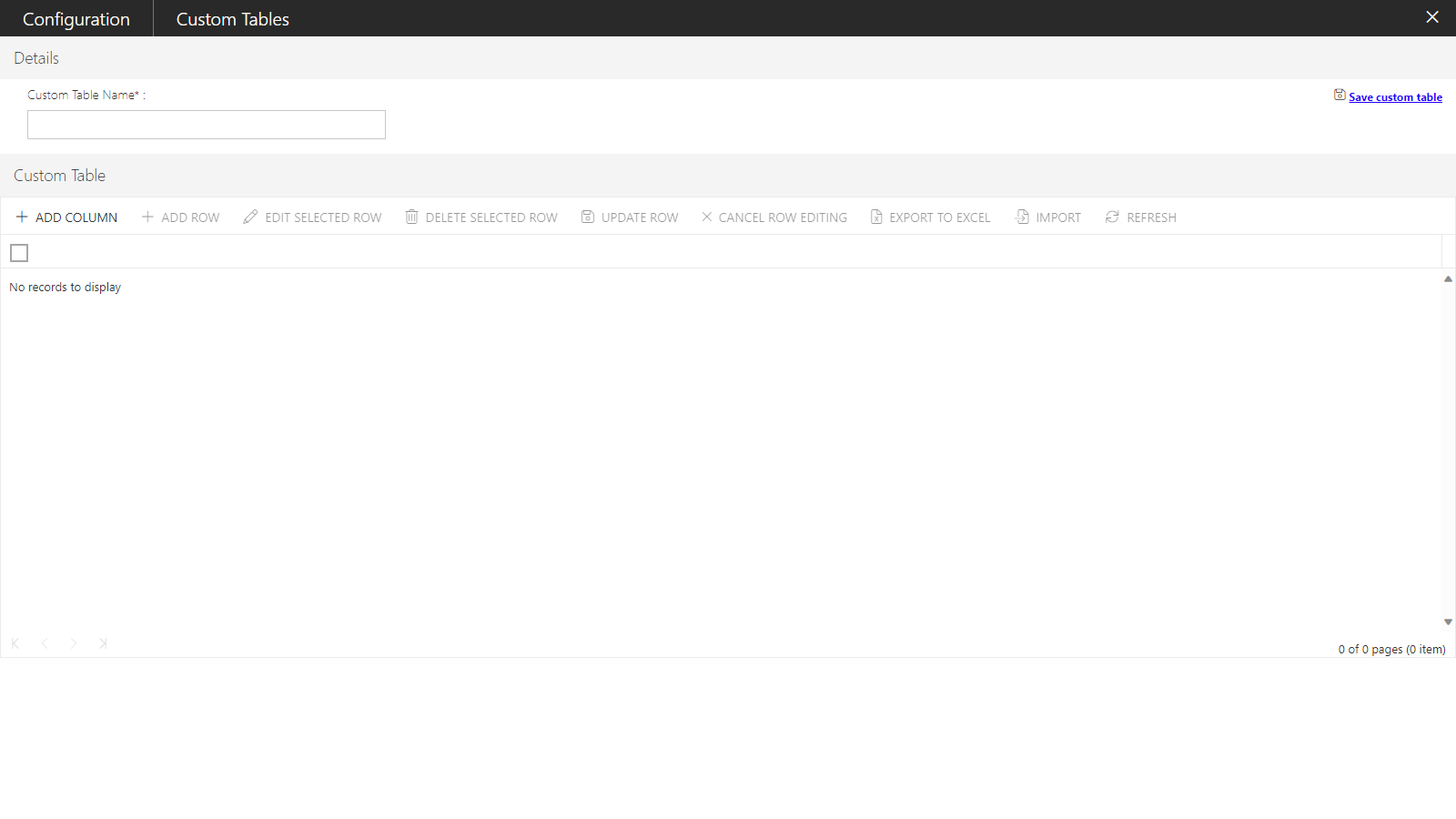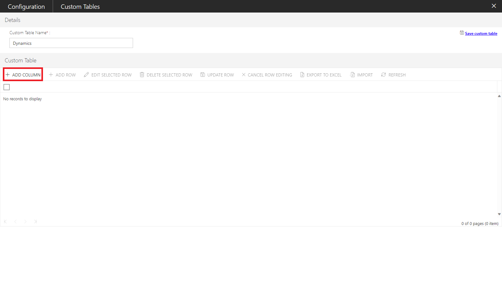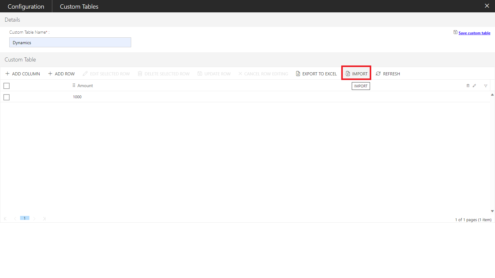 Note: The import option is enabled only, when at least a single column is defined in a Custom Table.