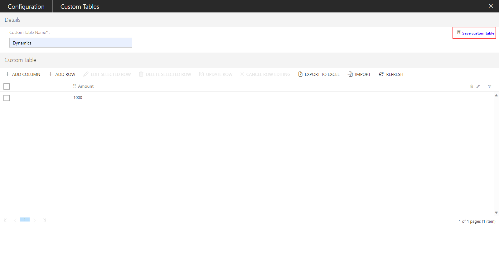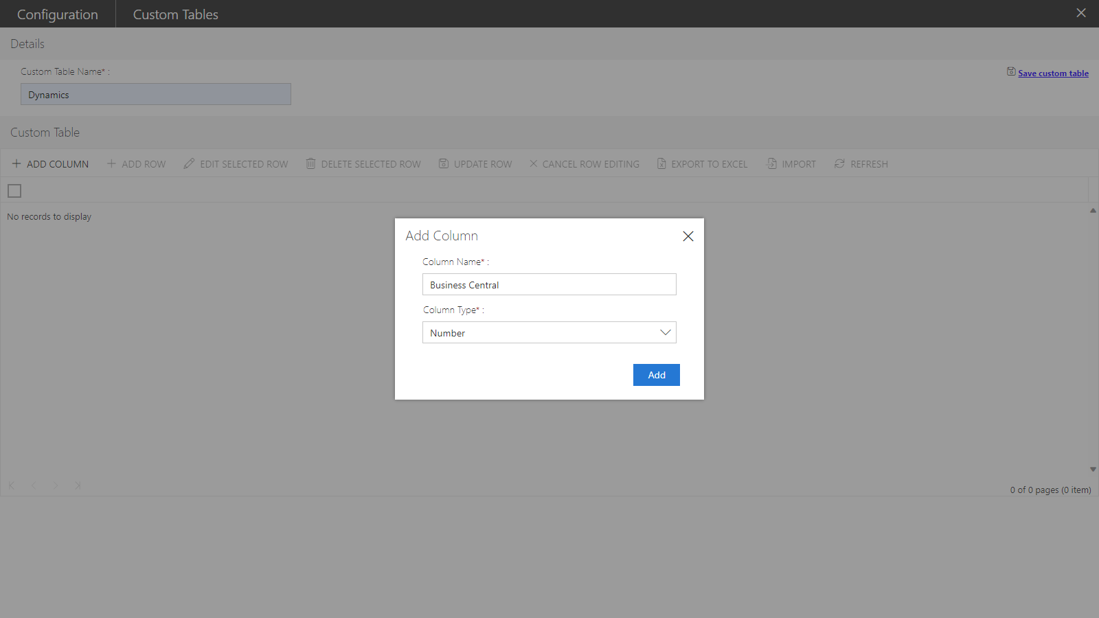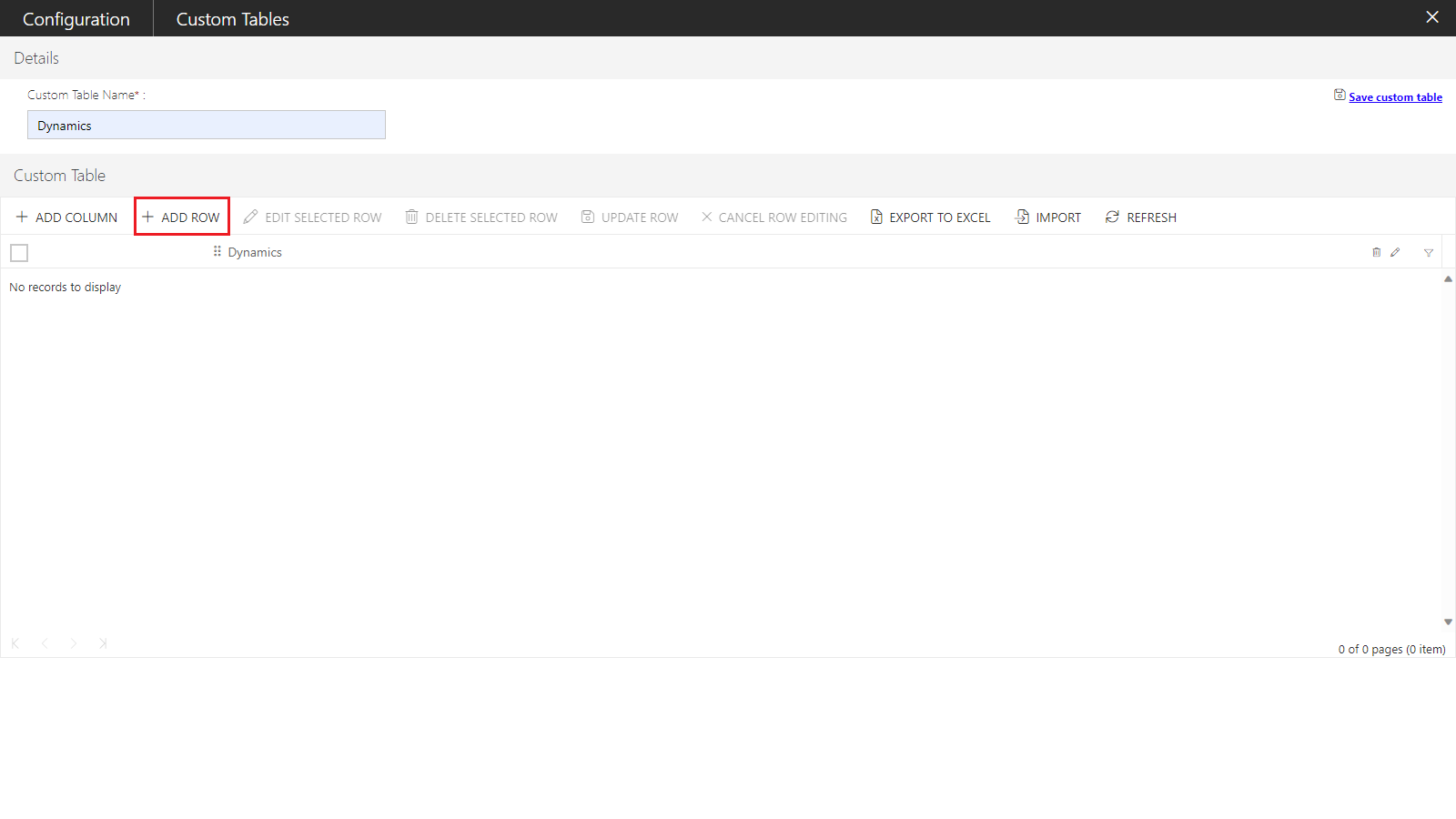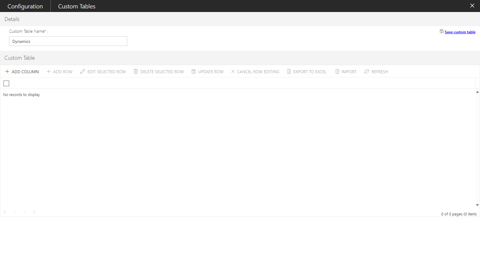Note: The import option is enabled only, when at least a single column is defined in a Custom Table.