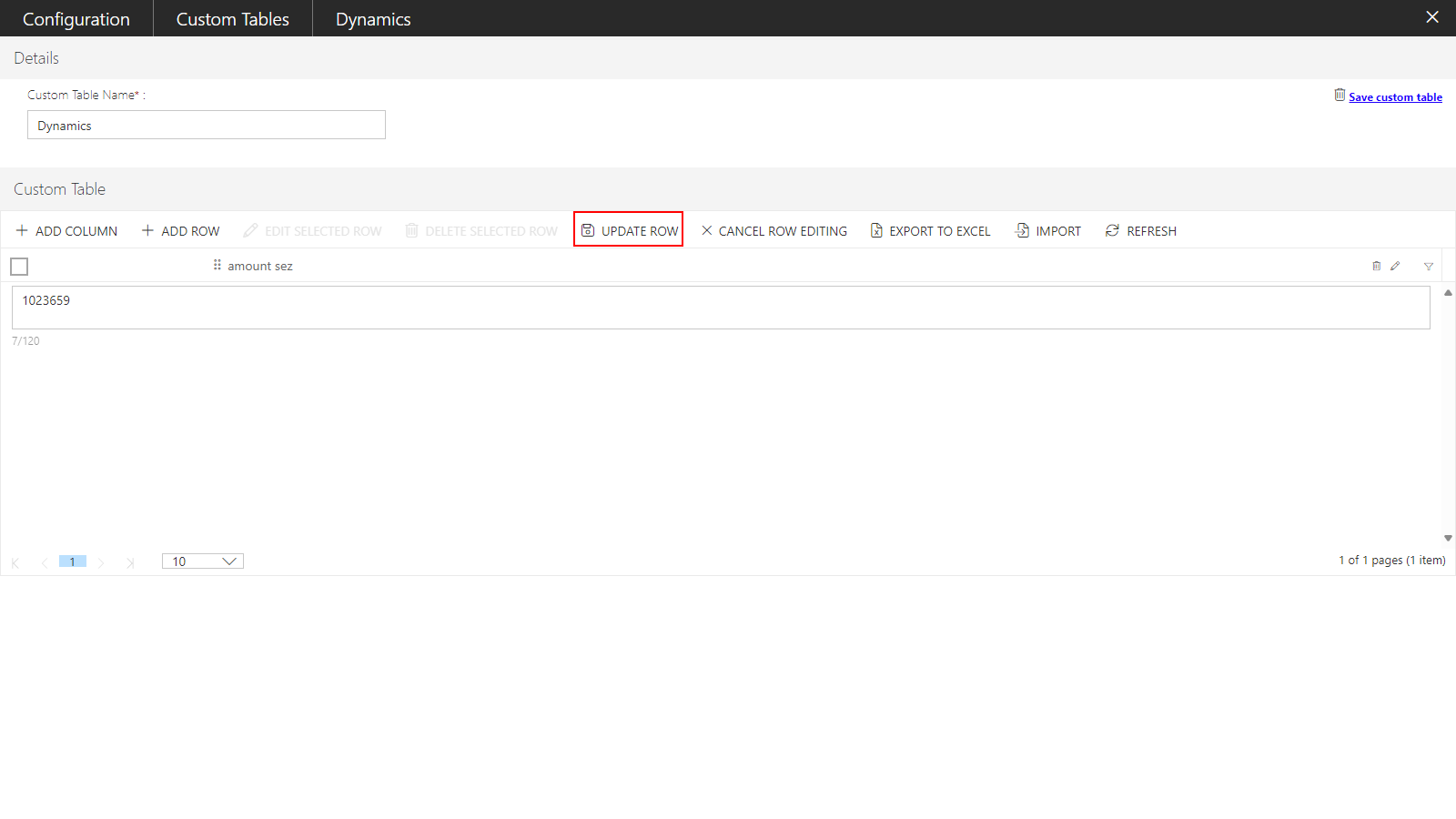 9) Now, fill in the details of the row and click on the UPDATE ROW option from the list toolbar to save the entered value in the row or click on any blank area of the grid.