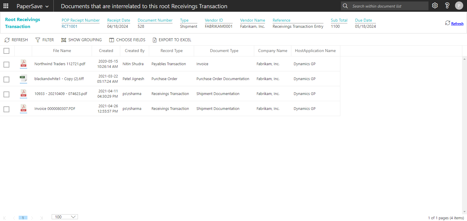 You can view the associated documents that are indirectly related to any record in an integrated application that PaperSave is integrated into. Follow the below steps to view the interrelated documents for Dynamics GP record: