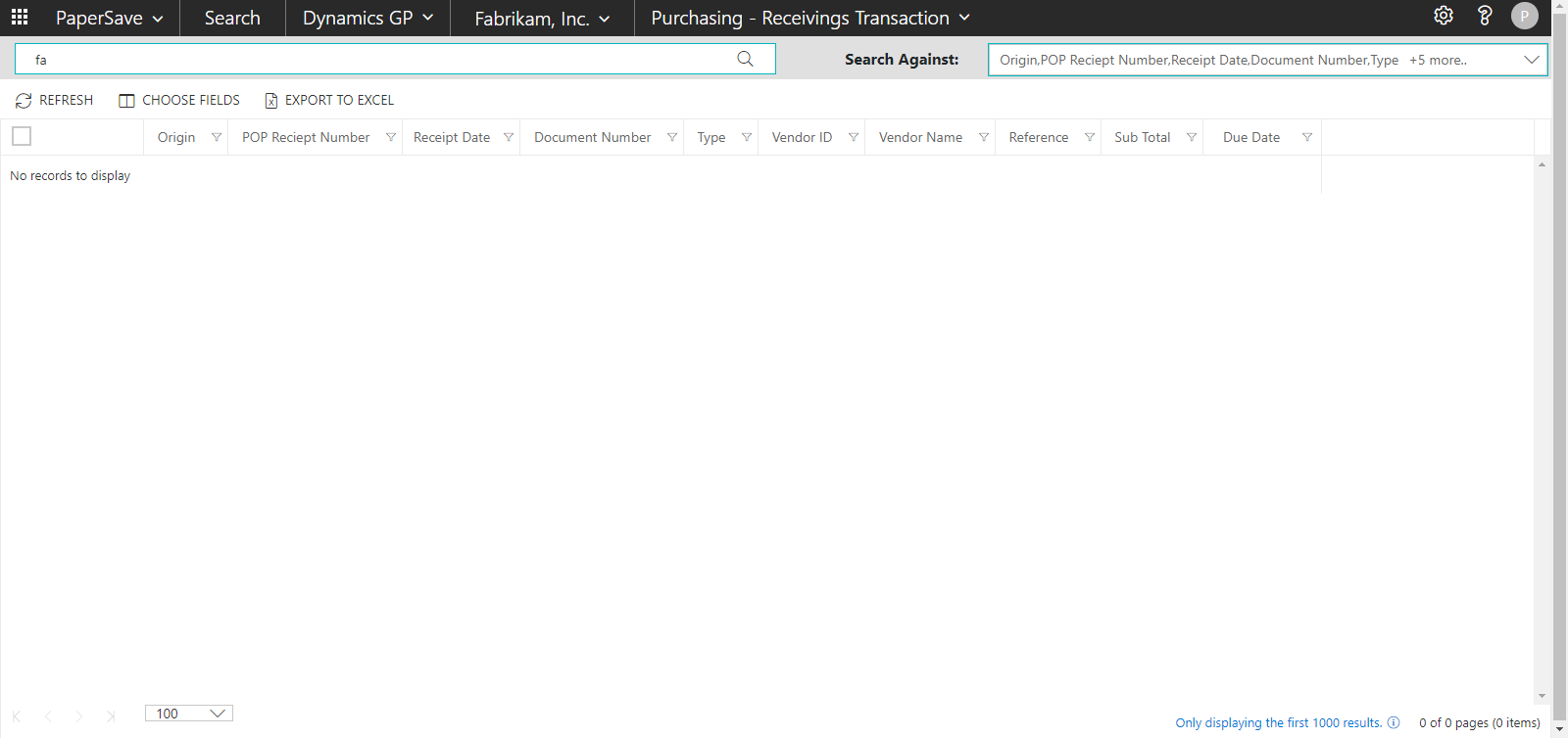 2) Enter the keywords to search documents for the desired record type in Dynamics GP. Then, press Enter on the keyboard or click on the search icon